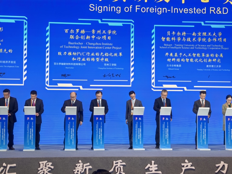 论坛现场成果丰硕:江苏省生物医药全产业链开放创新联盟启动,新能源产业链枢纽平台发布,一批高水平研发项目集中签约。其中,常州工学院与德资企业百尔罗赫新材料科技有限公司签约联合创新中心项目,副校长李雄威与百尔罗赫中国区技术总监Tan Kim Ho共同签署协议。双方将依托学校科研优势与企业产业资源,聚焦新材料研发应用,为新能源汽车产业链补链强链提供技术支撑,是江苏产学研融合的典型实践。