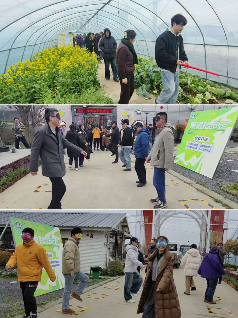 活动中,农场主理人带领大家参观了创意特色美陈、各种蔬菜大棚、特色名贵花卉等,还详尽地分享了绿植养护心得与自然生活美学,使大家在近距离接触田园风光的同时,体悟自然生活的美好。游戏环节,大家10人一组进行“蒙眼踏步”竞赛,现场高潮迭起,欢笑声不断,大家在互动中增进团结,在笑声中愉悦心情、放松身心。